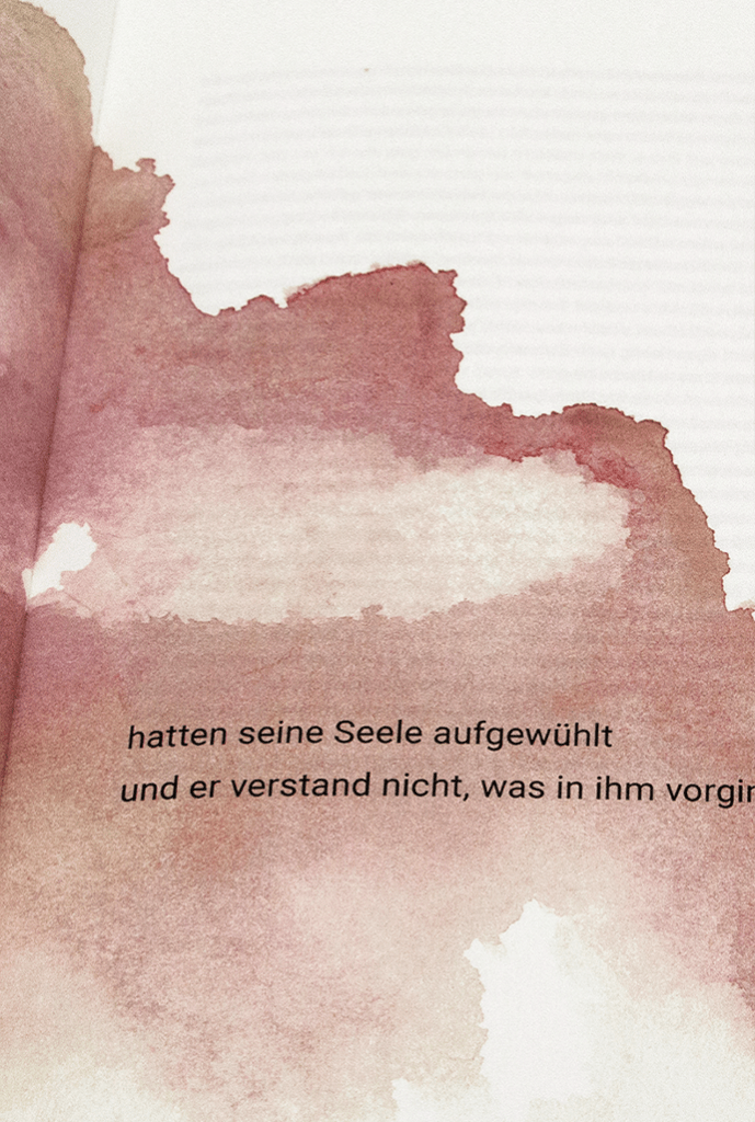 Die abstrakten Aquarelle, in Kombination mit statischer Typografie ermöglichen eine freie Interpretation des Abgebildeten. Das Bildkonzept spielt dabei mit dem Erkennen und Nicht-Erkennen von Form, Farbe und Struktur. Mal ist der Eindruck bildhafter (man erkennt Berggipfel, Wiesen, Wolkenformationen) und an anderer Stelle erinnern die Bilder eher an Gesteinsstrukturen oder organische Formen. Die Bildwelt steht dabei im Kontrast zum klaren, linear betonten Satz des Romans – Handlung und Gedanken laufen separiert voneinander auf zwei Ebenen.